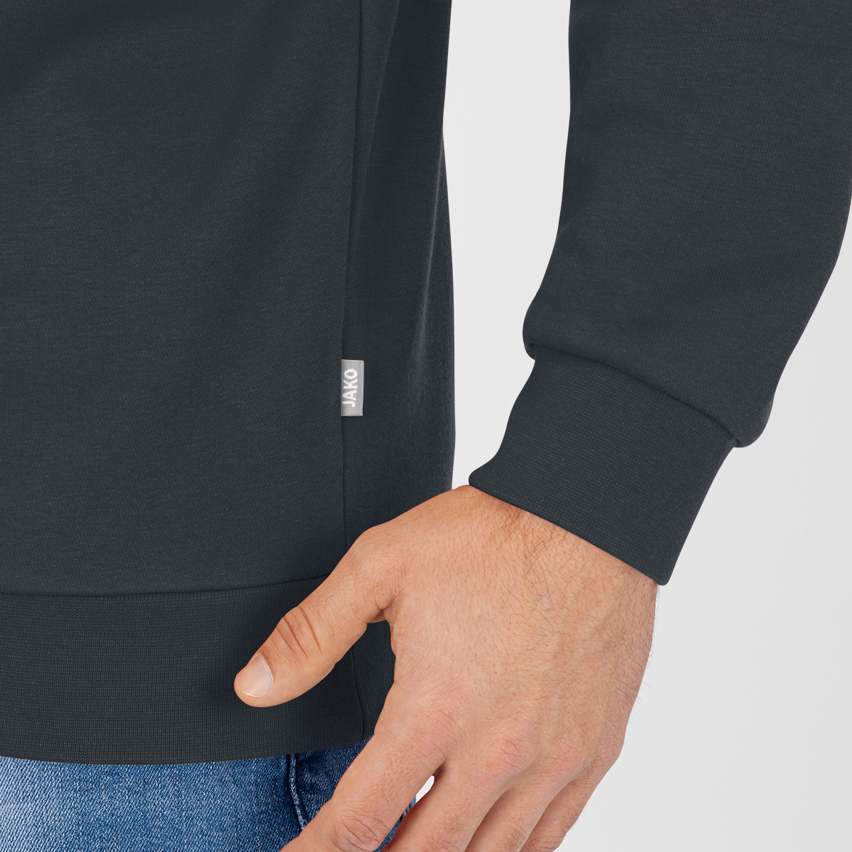 Majhna etiketa z logotipom JAKO na levi strani ziptopa omogoča enostavno in estetsko personalizacijo z logotipom vašega podjetja, če ga uporabljate kot službeno oblačilo.